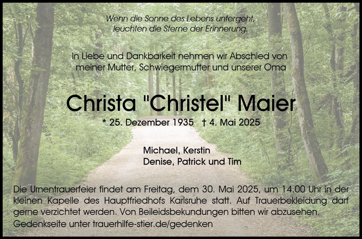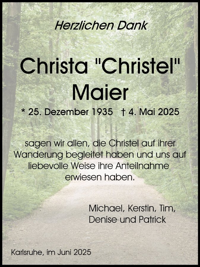 wir sind noch in Urlaub und können leider bei der Trauerfeier von Christel nicht dabei sein. 😔