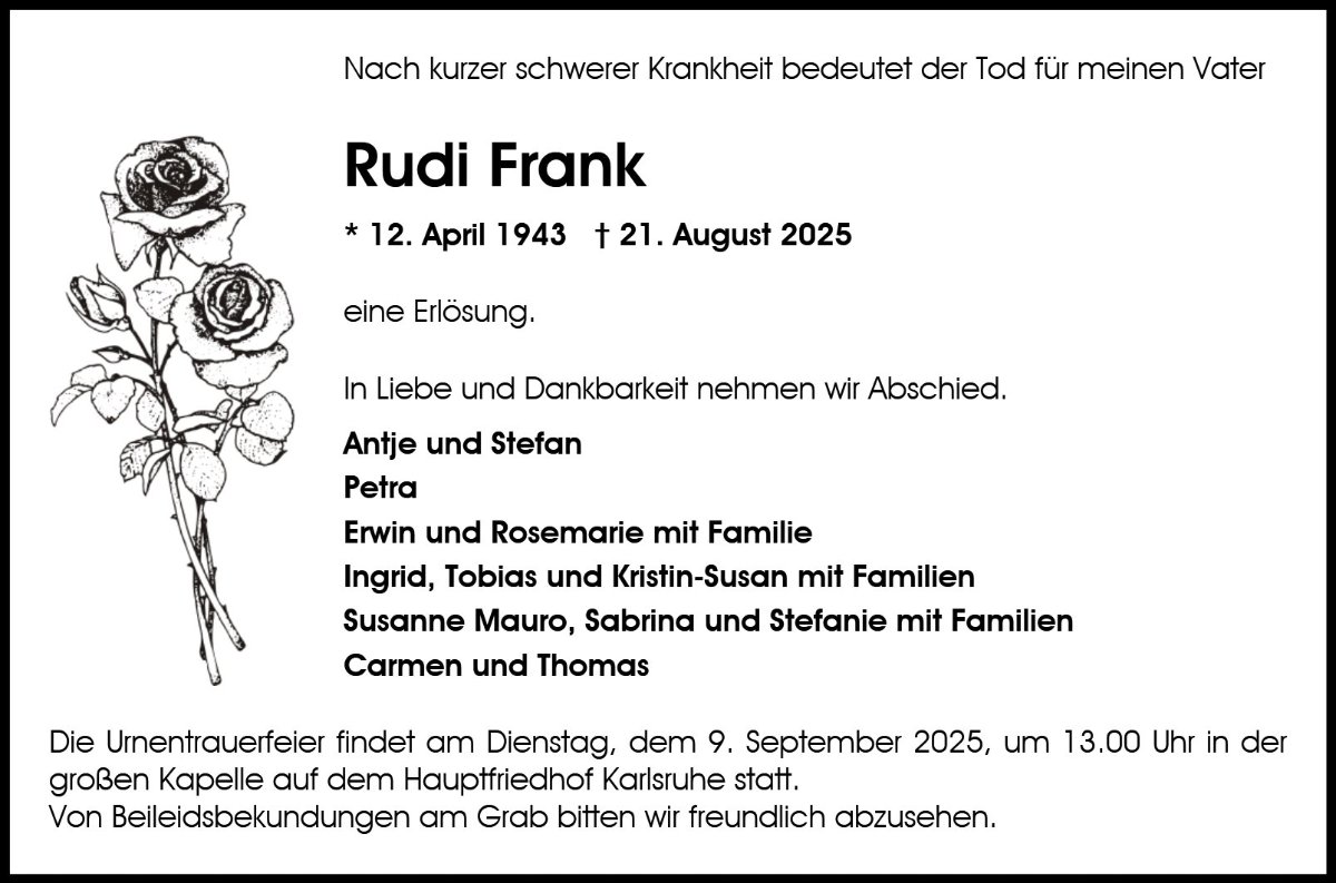 Liebe Familie Antje Schick, Angehörige und Freunde von Herrn Rudi Max Frank.