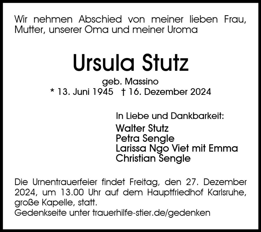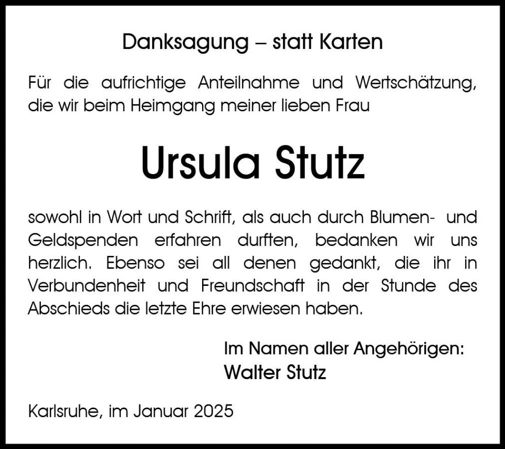 zum Tod von Frau Ursula Stutz sprechen wir Ihnen und allen Angehörigen unser herzliches Beileid aus.